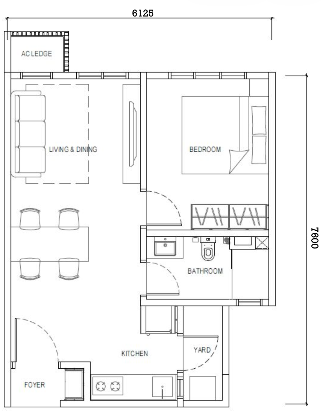 667 SF (62SM) . 2 Rooms & 2 Bathrooms