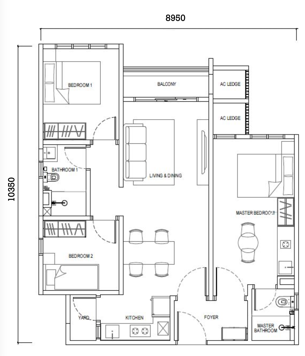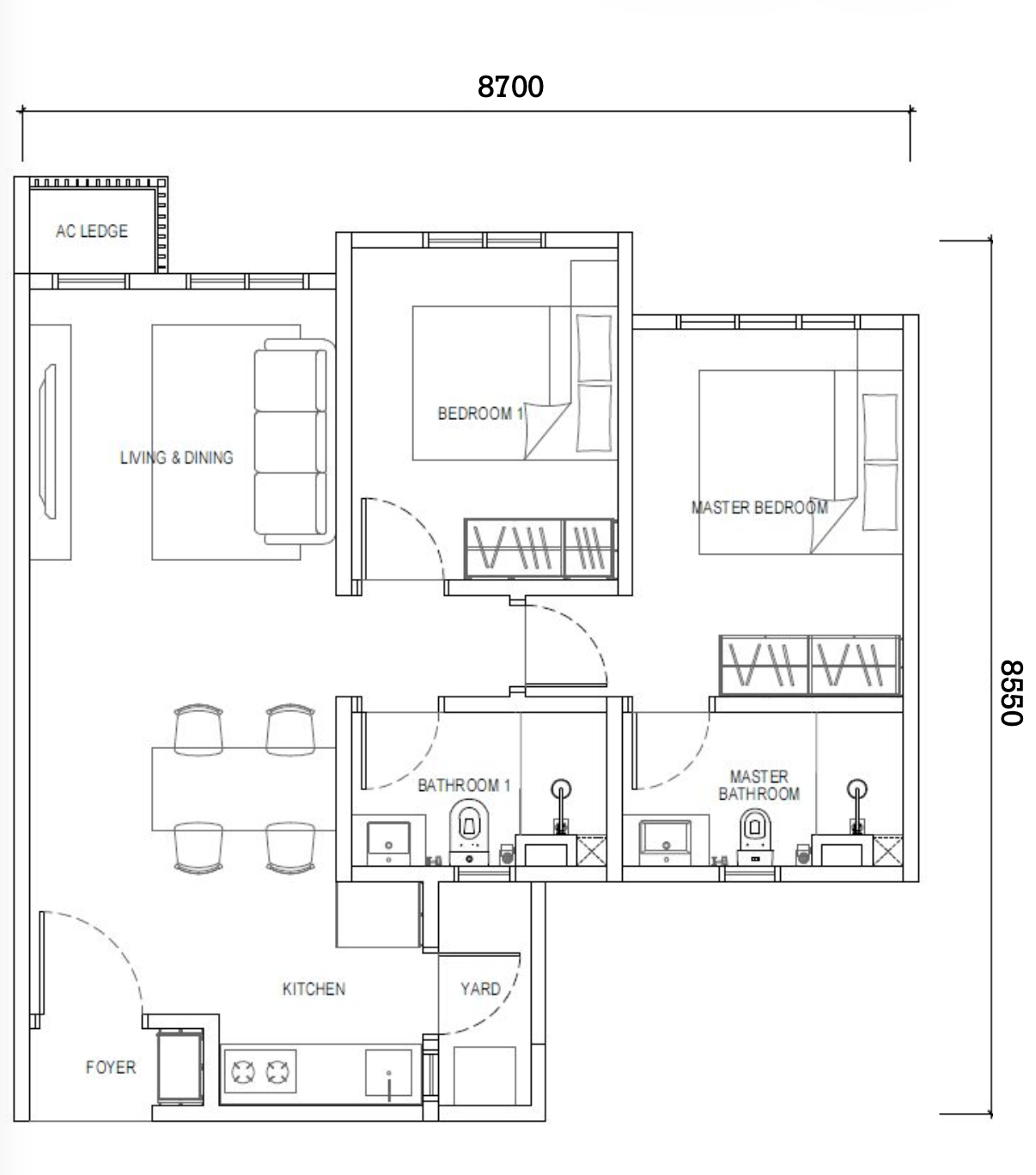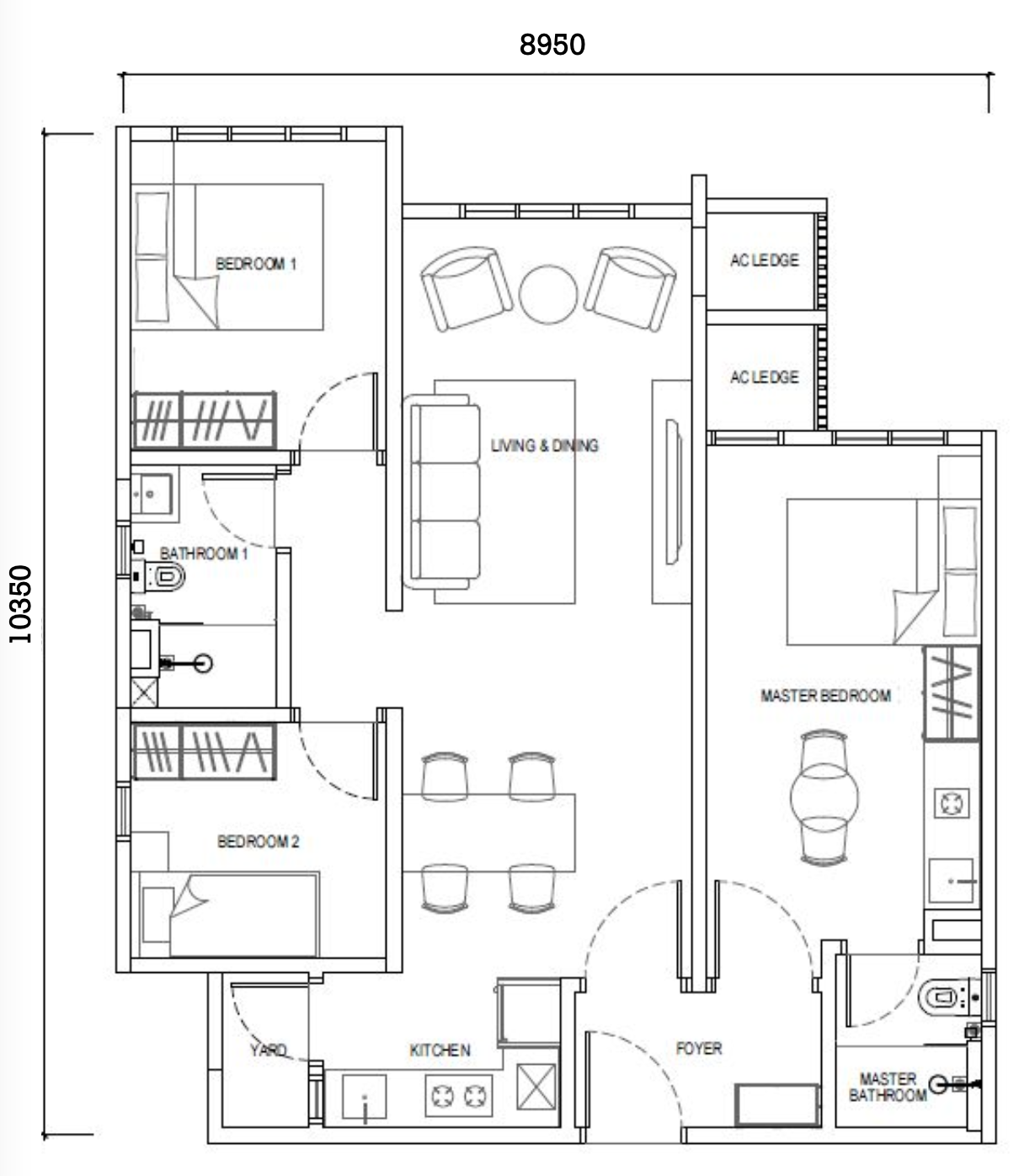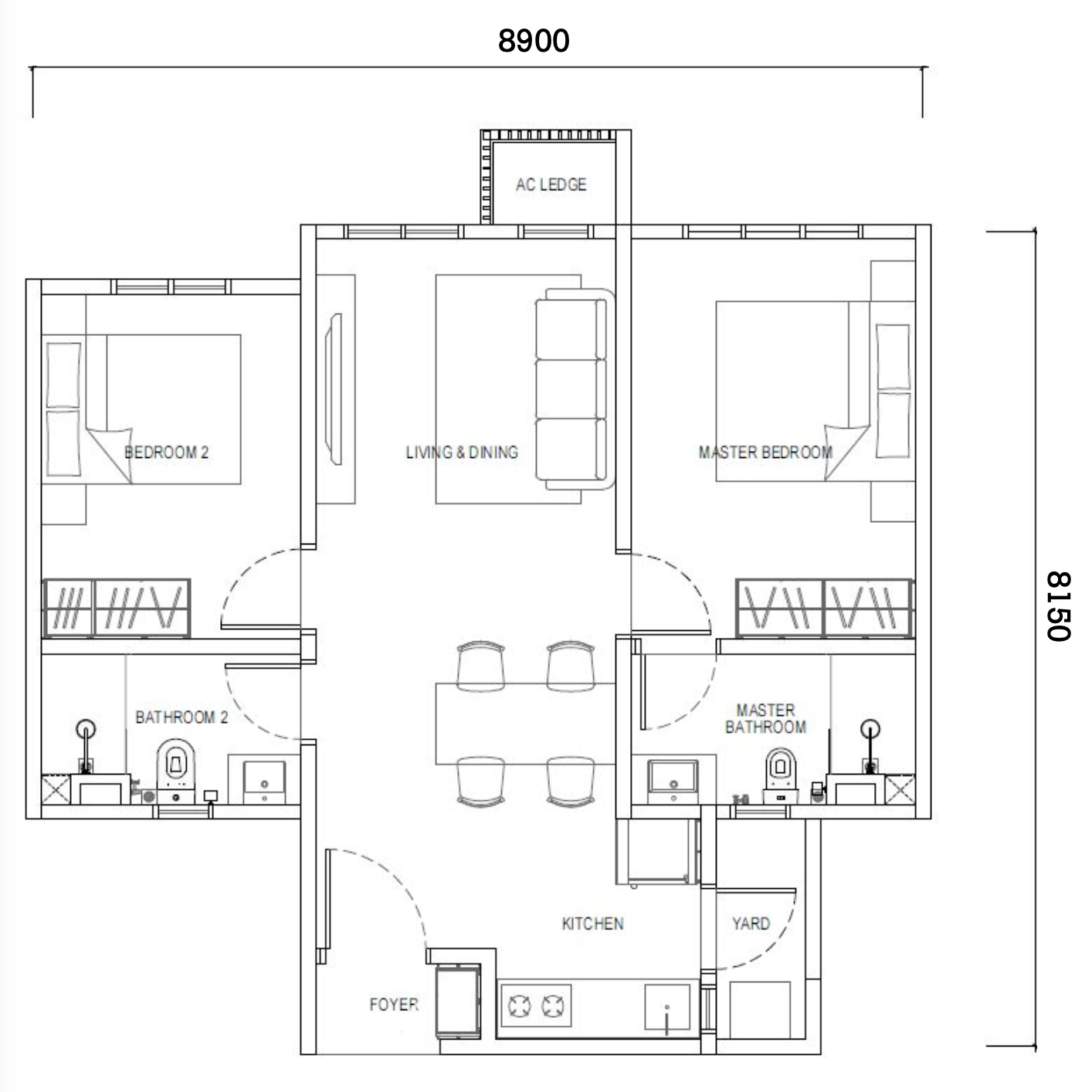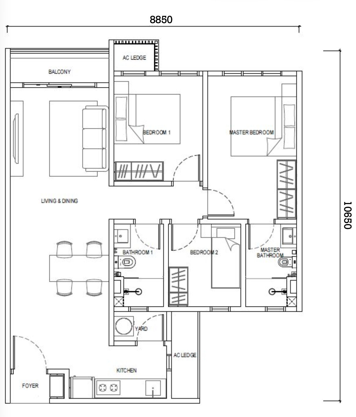 850 SF (79 SM) . 3 Rooms & 2 Bathrooms